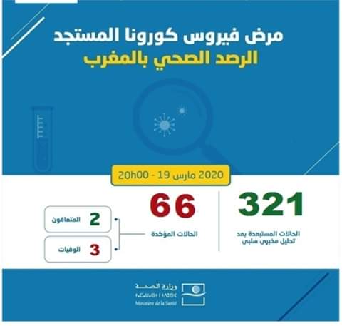 أعلنت وزارة الصحة عبر صفحتها الرسمية على الفايسبوك، أنه تم اليوم الجمعة، تسجيل (3) حالات إصابة جديدة مؤكدة بفيروس كورونا المستجد، تم تأكيدها مخبريا بمعهد باستور-المغرب والمختبر الوطني للأنفلونزا والفيروسات التنفسية بالمعهد الوطني للصحة بالرباط، لصبح مجموع الحالات لحد هذا الإعلان 66 حالة.