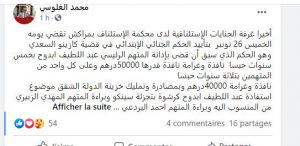 وتابع المحامي محمد الغلوسي أن المحكمة قضت أيضا بمصادرة وتمليك خزينة الدولة الشقق موضوع استفادة عبد اللطيف ابدوح كرشوة بتجزئة سينكو، وبراءة المتهم المهدي الزبيري من المنسوب اليه وبراءة المتهم احمد البردعي من جناية المشاركة في تبديد اموال عمومية وسقوط الدعوى العمومية في حقه بالنسبة للتهم الأخرى، والحكم على المتهم عبد الغني المتسلي بسنتين حبسا نافذة وغرامة قدرها 30000درهم.