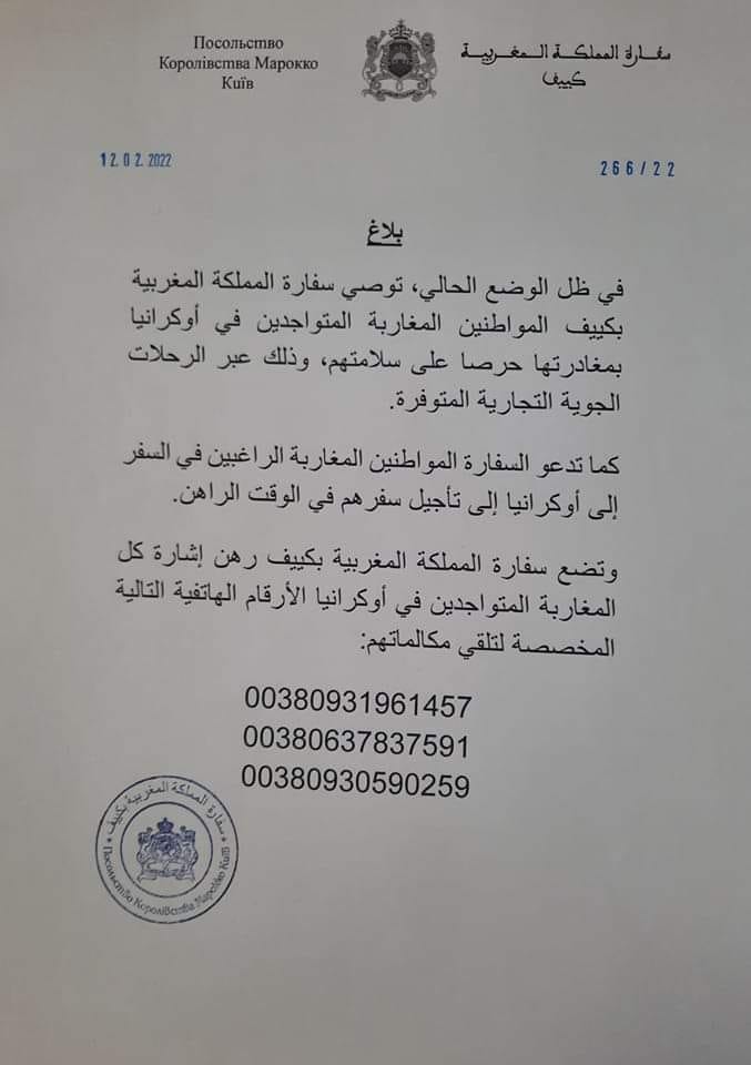 كما يضيف البلاغ أن السفارة المغربية تدعو المواطنين المغاربة الراغبين في السفر إلى أوكرانيا إلى التأجيل ذلك في الوقت الراهن.