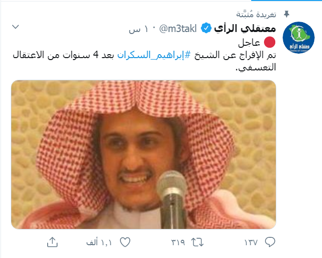 أعلن حساب معتقلي الرأي على تويتر، وهو  حساب يعنى بالدفاع عن المعتقلين بالمملكة العربية السعودية، عن الإفراج عن الشيخ إبراهيم السكران بعد 4 سنوات من الاعتقال التعسفي.