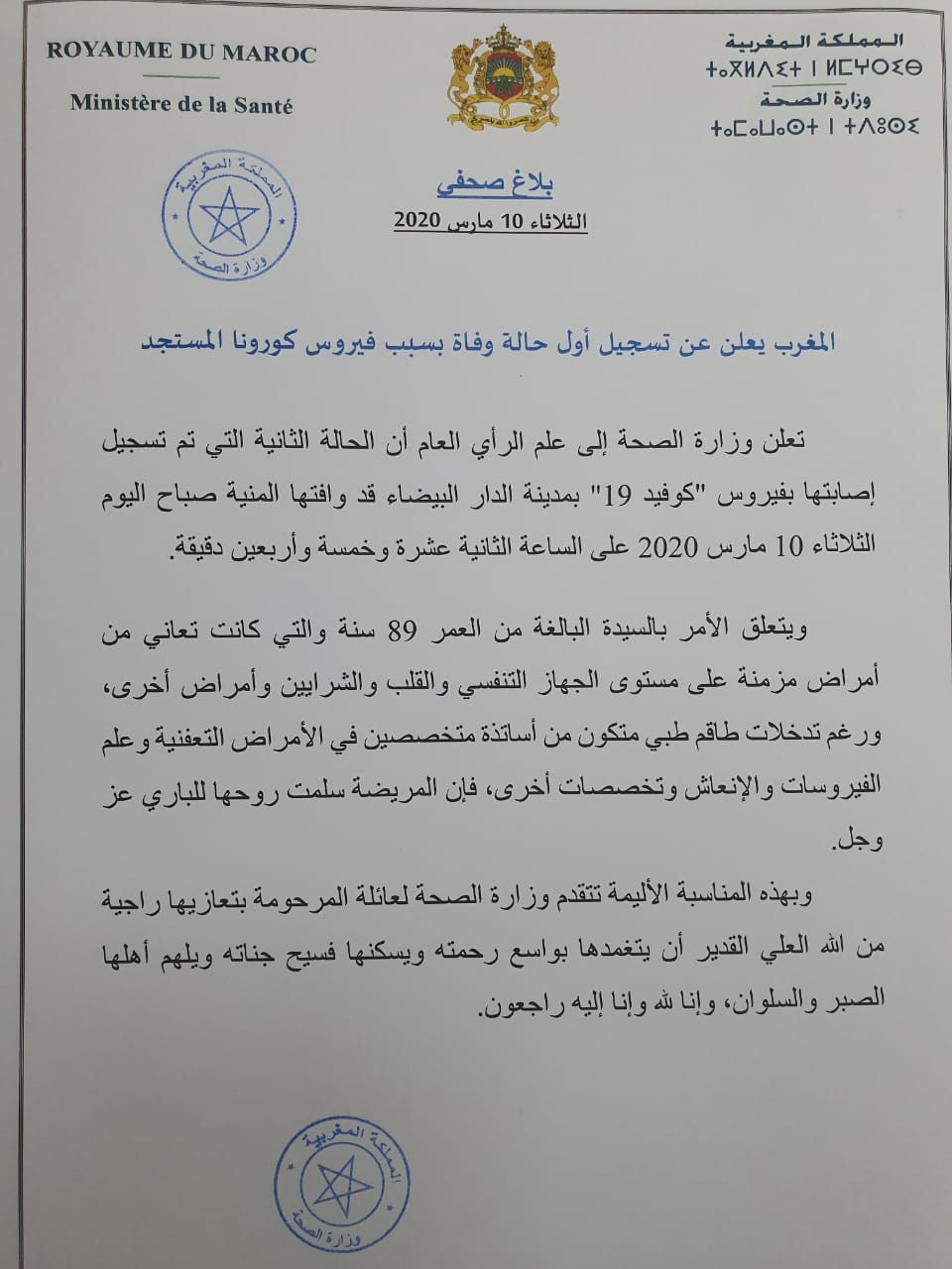 عاجل المغرب يسجل أول حالة وفاة بسبب فيروس كورونا (بلاغ)