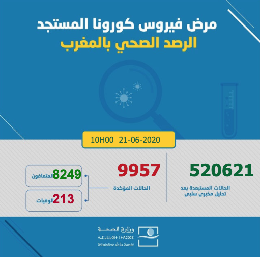ارتفع عدد الإصابات بفيروس كورونا في المملكة المغربية اليوم الأحد 21 يونيو 2020، إلى حدود الساعة العاشرة صباحا، إلى 9957 حالة، حيث أفادت معطيات وزارة الصحة الرسمية تسجيل زيادة 118 حالات جديدة، ليرتفع إجمالي الإصابات التي تم تسجيلها إلى 9957 حالة مؤكدة.