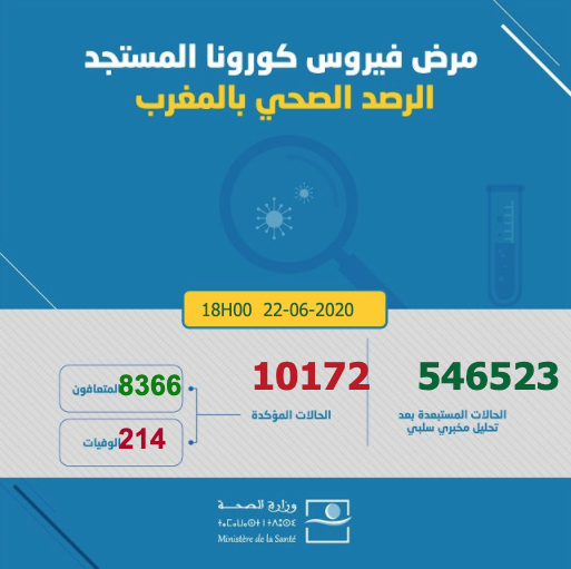 ارتفع عدد الإصابات بفيروس كورونا في المملكة المغربية اليوم الإثنين 22 يونيو 2020، إلى حدود الساعة السادسة مساء، إلى 10172 حالة، حيث أفادت معطيات وزارة الصحة الرسمية تسجيل زيادة 195 حالات جديدة، ليرتفع إجمالي الإصابات التي تم تسجيلها إلى 10172 حالة مؤكدة.