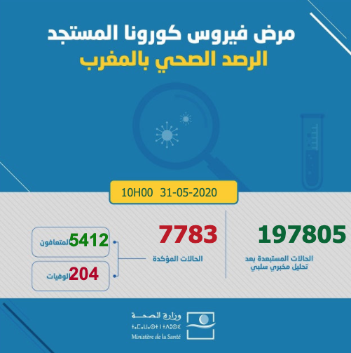 ارتفع عدد الإصابات بفيروس كورونا في المملكة المغربية اليوم الأحد 31 ماي 2020، إلى حدود الساعة العاشرة صباحا، إلى7783 حالة، حيث أفادت معطيات وزارة الصحة الرسمية تسجيل زيادة ب 3 حالات جديدة، ليرتفع إجمالي الإصابات التي تم تسجيلها إلى 7783 حالة مؤكدة.
