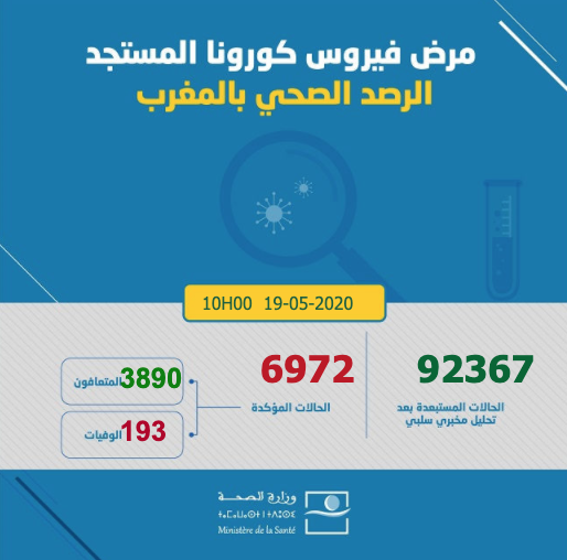 ارتفع عدد الإصابات بفيروس كورونا في المملكة المغربية اليوم الثلاثاء 19 ماي 2020، إلى حدود الساعة العاشرة صباحا، إلى 6972 حالة، حيث أفادت معطيات وزارة الصحة الرسمية تسجيل زيادة ب 20 حالة جديدة، ليرتفع إجمالي الإصابات التي تم تسجيلها إلى 6972 حالة مؤكدة.