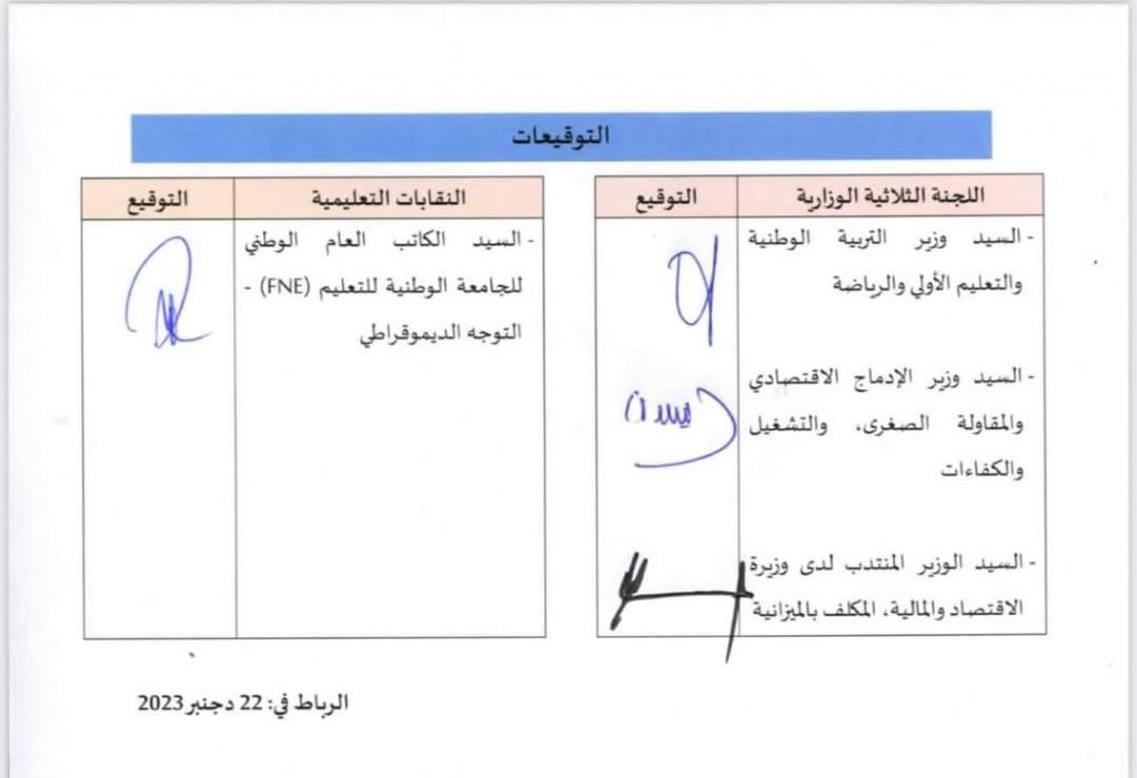 وينص المحضر على التحاق نقابة الجامعة الوطنية للتعليم (FNE) – التوجه الديموقراطي بالحوار القطاعي حول صياغة