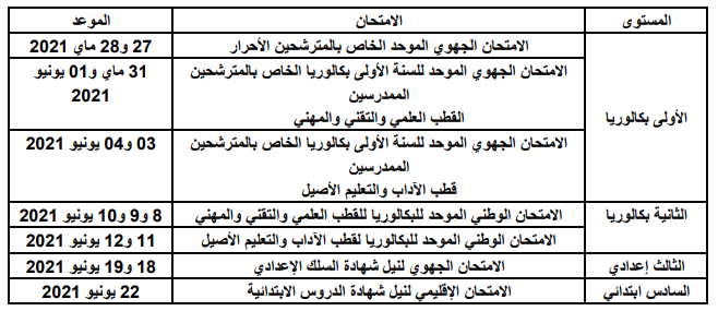 تعلن وزارة التربية الوطنية والتكوين المهني والتعليم العالي والبحث العلمي، قطاع التربية الوطنية، أنه نظرا للوضعية الاستثنائية التي تعرفها منظومتنا التربوية، منذ انطلاق الموسم الدراسي الحالي والناتجة عن اتخاذ تدابير تربوية واحترازية للوقاية من تفشي جائحة كوفيد – 19، وذلك حفاظا على صحة وسلامة التلميذات والتلاميذ والأطر التربوية والإدارية، فإن الامتحانات المدرسية الإشهادية الخاصة بالأسلاك التعليمية الثلاثة (الثانوي التأهيلي والإعدادي والابتدائي) برسم دورة 2021 ستجرى في المواعد التالية: