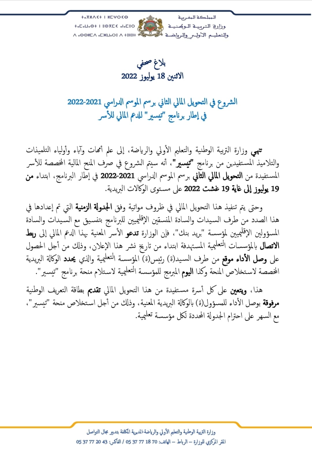 أنهت وزارة التربية الوطنية والتعليم الأولي والرياضة، إلى علم أمهات وآباء وأولياء التلميذات والتلاميذ المستفيدين من برنامج “تيسير”، أنه سيتم الشروع في صرف المنح المالية المخصصة للأسر المستفيدة من التحويل المالي الثاني برسم الموسم الدراسي 2021-2022 في إطار البرنامج، ابتداء من 19 يوليوز إلى غاية 19 غشت 2022 على مستوى الوكالات البريدية.