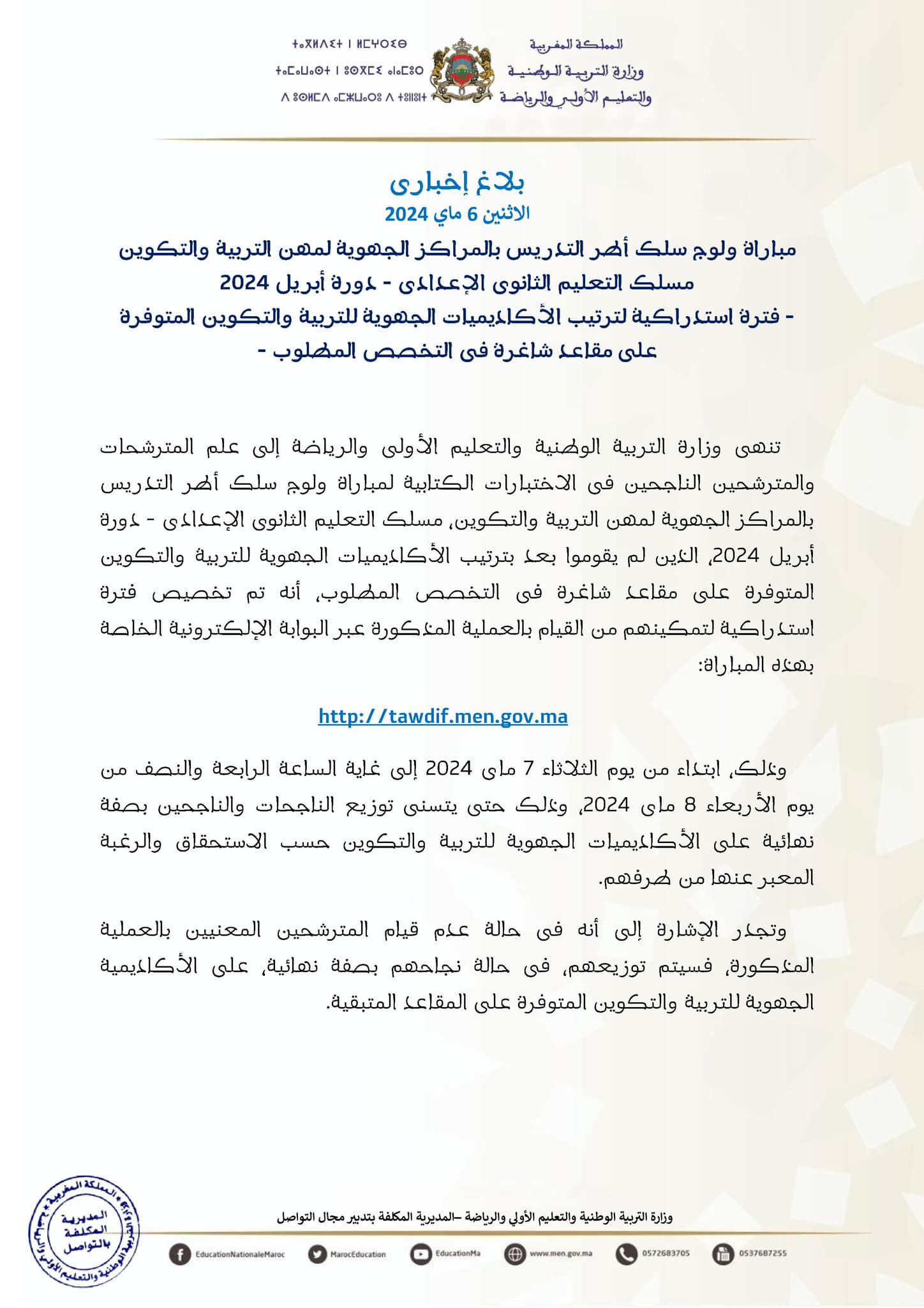 وذلك، حسب بلاغ الوزارة، ابتداء من يوم الثلاثاء 7 ماي 2024 إلى غاية الساعة الرابعة والنصف من يوم الأربعاء 8 ماي 2024، وذلك حتى يتسنى توزيع الناجحات والناجحين بصفة نهائية على الأكاديميات الجهوية للتربية والتكوين حسب الاستحقاق والرغبة المعبر عنها من طرفهم.