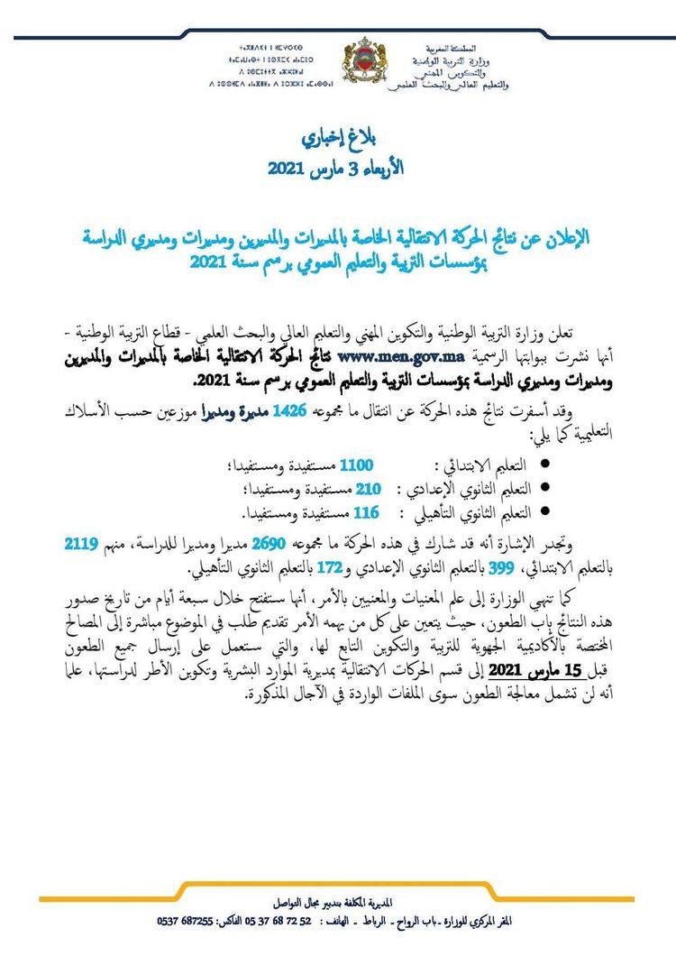 وأسفرت النتائج وفق بلاغ للوزارة، عن انتقال ما مجموعه 1426 مديرة ومديرا موزعين على مختلف الأسلاك التعليمية، منهم 1100 مستفيد بالتعليم الابتدائي، و210 مستفيد بالتعليم الإعدادي الثانوي، و116 مستفيد بالتعليم الثانوي التأهيلي.