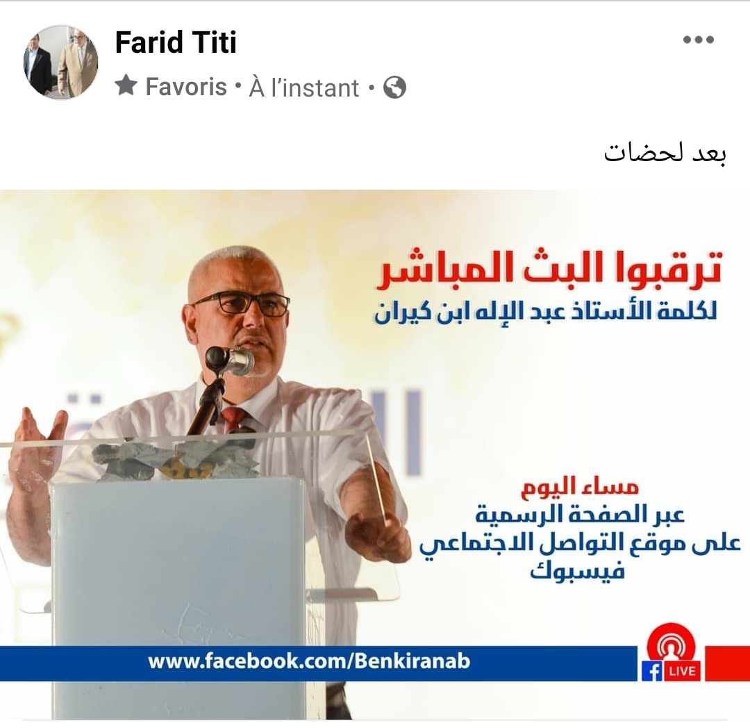 أعلن عبد الاله بنكيران رئيس الحكومة السابق والأمين العام لحزب العدالة والتنمية، عن لقاء خاص مساء اليوم الأربعاء على صفحته الرسمية بموقع التواصل الاجتماعي فايسبوك.