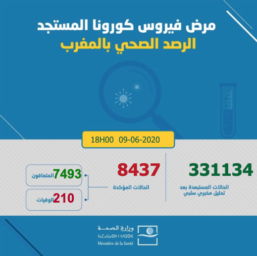 ارتفع عدد الإصابات بفيروس كورونا في المملكة المغربية اليوم الثلاثاء 09 يونيو 2020، إلى حدود الساعة السادسة مساء، إلى 8437 حالة، حيث أفادت معطيات وزارة الصحة الرسمية تسجيل زيادة ب 135 حالات جديدة، ليرتفع إجمالي الإصابات التي تم تسجيلها إلى 8437 حالة مؤكدة.