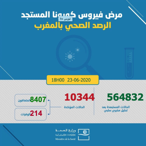 ارتفع عدد الإصابات بفيروس كورونا في المملكة المغربية اليوم الثلاثاء 23 يونيو 2020، إلى حدود الساعة السادسة مساء، إلى 10344 حالة، حيث أفادت معطيات وزارة الصحة الرسمية تسجيل زيادة 172 حالات جديدة، ليرتفع إجمالي الإصابات التي تم تسجيلها إلى 10344 حالة مؤكدة.