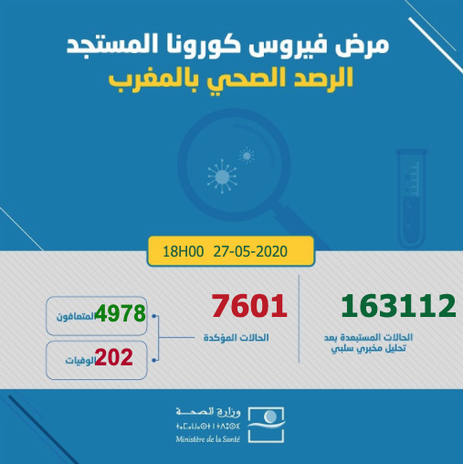 ارتفع عدد الإصابات بفيروس كورونا في المملكة المغربية اليوم الأربعاء 27 ماي 2020، إلى حدود الساعة السادسة مساء، إلى 7601 حالة، حيث أفادت معطيات وزارة الصحة الرسمية تسجيل زيادة ب 24 حالة جديدة، ليرتفع إجمالي الإصابات التي تم تسجيلها إلى 7601 حالة مؤكدة.