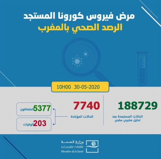 ارتفع عدد الإصابات بفيروس كورونا في المملكة المغربية اليوم السبت 30 ماي 2020، إلى حدود الساعة العاشرة صباحا، إلى 7740 حالة، حيث أفادت معطيات وزارة الصحة الرسمية تسجيل زيادة ب 26 حالة جديدة، ليرتفع إجمالي الإصابات التي تم تسجيلها إلى 7740 حالة مؤكدة.