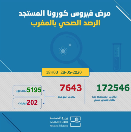 ارتفع عدد الإصابات بفيروس كورونا في المملكة المغربية اليوم الخميس 28 ماي 2020، إلى حدود الساعة السادسة مساء، إلى 7643 حالة، حيث أفادت معطيات وزارة الصحة الرسمية تسجيل زيادة ب 42 حالة جديدة، ليرتفع إجمالي الإصابات التي تم تسجيلها إلى 7643 حالة مؤكدة.