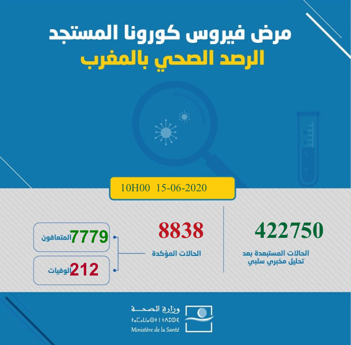 ارتفع عدد الإصابات بفيروس كورونا في المملكة المغربية اليوم الإثنين 15 يونيو 2020، إلى حدود الساعة العاشرة صباحا، إلى 8838 حالة، حيث أفادت معطيات وزارة الصحة الرسمية تسجيل زيادة ب 45 حالات جديدة، ليرتفع إجمالي الإصابات التي تم تسجيلها إلى 8838 حالة مؤكدة.