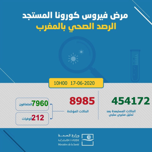 ارتفع عدد الإصابات بفيروس كورونا في المملكة المغربية اليوم الأربعاء 17 يونيو 2020، إلى حدود الساعة العاشرة صباحا، إلى 8985حالة، حيث أفادت معطيات وزارة الصحة الرسمية تسجيل زيادة ب 54 حالات جديدة، ليرتفع إجمالي الإصابات التي تم تسجيلها إلى 8985 حالة مؤكدة.