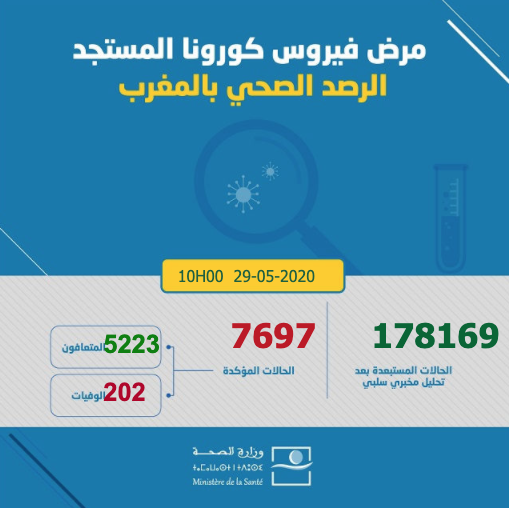 ارتفع عدد الإصابات بفيروس كورونا في المملكة المغربية اليوم الجمعة 29 ماي 2020، إلى حدود الساعة العاشرة صباحا، إلى 7697 حالة، حيث أفادت معطيات وزارة الصحة الرسمية تسجيل زيادة ب 54 حالة جديدة، ليرتفع إجمالي الإصابات التي تم تسجيلها إلى 7697 حالة مؤكدة.