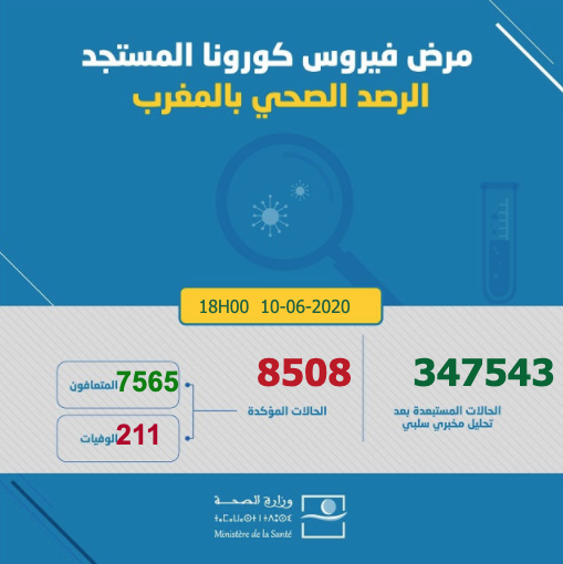 ارتفع عدد الإصابات بفيروس كورونا في المملكة المغربية اليوم الأربعاء 10 يونيو 2020، إلى حدود الساعة السادسة مساء، إلى 8508 حالة، حيث أفادت معطيات وزارة الصحة الرسمية تسجيل زيادة ب 71 حالات جديدة، ليرتفع إجمالي الإصابات التي تم تسجيلها إلى 8508 حالة مؤكدة.