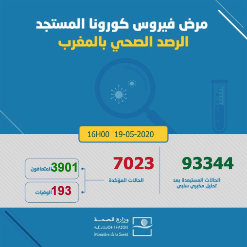 ارتفع عدد الإصابات بفيروس كورونا في المملكة المغربية اليوم الثلاثاء 19 ماي 2020، إلى حدود الساعة الرابعة بعد الزوال ، إلى 7023 حالة، حيث أفادت معطيات وزارة الصحة الرسمية تسجيل زيادة ب 71 حالة جديدة، ليرتفع إجمالي الإصابات التي تم تسجيلها إلى 7023 حالة مؤكدة.