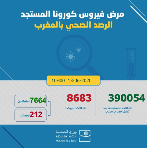 ارتفع عدد الإصابات بفيروس كورونا في المملكة المغربية اليوم السبت 13 يونيو 2020، إلى حدود الساعة العاشرة صباحا، إلى 8683 حالة، حيث أفادت معطيات وزارة الصحة الرسمية تسجيل زيادة ب 73 حالات جديدة، ليرتفع إجمالي الإصابات التي تم تسجيلها إلى 8683 حالة مؤكدة.
