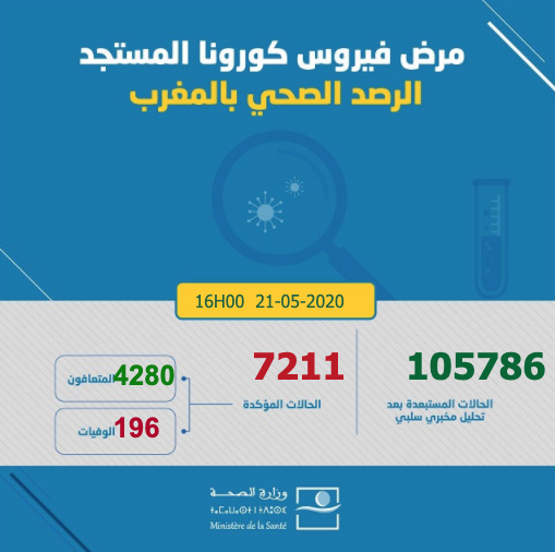 ارتفع عدد الإصابات بفيروس كورونا في المملكة المغربية اليوم الخميس 21 ماي 2020، إلى حدود الساعة الرابعة بعد الزوال، إلى 7211 حالة، حيث أفادت معطيات وزارة الصحة الرسمية تسجيل زيادة ب 78 حالة جديدة، ليرتفع إجمالي الإصابات التي تم تسجيلها إلى 7211 حالة مؤكدة.