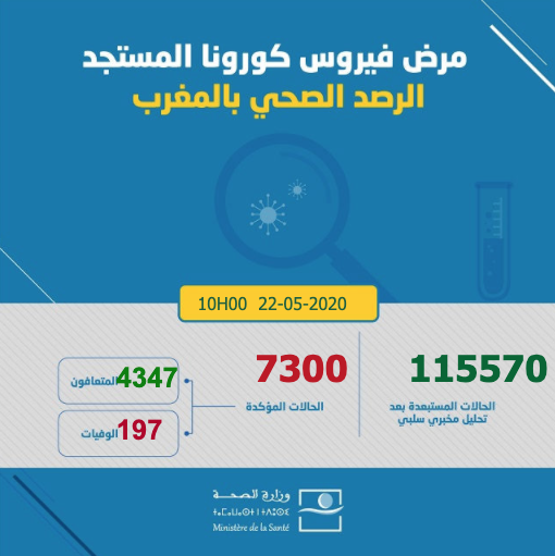 ارتفع عدد الإصابات بفيروس كورونا في المملكة المغربية اليوم الجمعة 22 ماي 2020، إلى حدود الساعة العاشرة صباحا، إلى 7300 حالة، حيث أفادت معطيات وزارة الصحة الرسمية تسجيل زيادة ب 89 حالة جديدة، ليرتفع إجمالي الإصابات التي تم تسجيلها إلى 7300 حالة مؤكدة.
