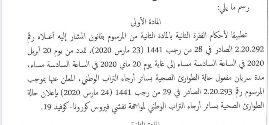 وحسب المصادر صادقت رئاسة الحكومة على تمديد الحجر الصحي إلى غاية 20 من شهر ماي القادم.