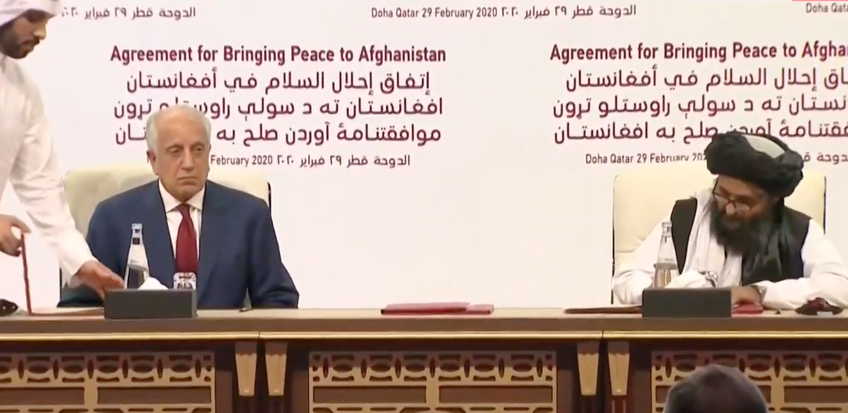 تم التوقيع في هذه اللحظات على اتفاق السلام بين حركة طالبان ممثلة بالمولى عبد الغني برادر ومن الجانب الأمريكي وقع زلماي خليل زادة.