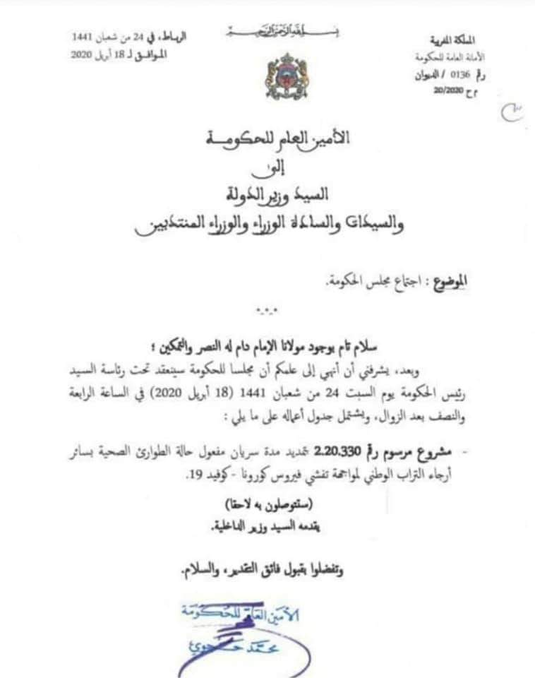 سيترأس رئيس الحكومة السيد سعد الدين العثماني في الساعة الرابعة والنصف من بعد زوال يوم السبت 24 شعبان 1441 (18 أبريل 2020).