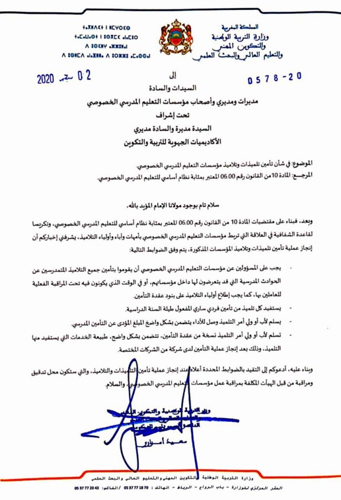 وختم الوزير مذكرته بدعوة مدراء المؤسسات الخاصة بالتقيد بالضوابط المحددة عند إنجاز عملية تأمين التلميذات والتلاميذ، والتي ستكون، محل تدقيق ومراقبة من قبل الهيئات المكلفة بمراقبة عمل مؤسسات التعليم المدرسي والخصوصي.