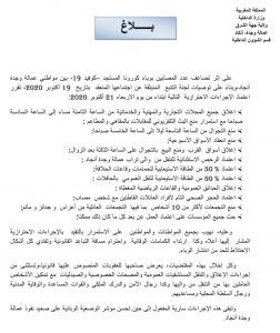قررت سلطات إقليم وجدة اعتماد إجراءات جديدة، ابتداء من يوم الأربعاء 21 أكتوبر 2020، للحد من انتشار فيروس كورونا المستجد بالإقليم، وأهمها فرض حظر التجوال من الساعة التاسعة ليلا إلى الساعة الخامسة صباحا.