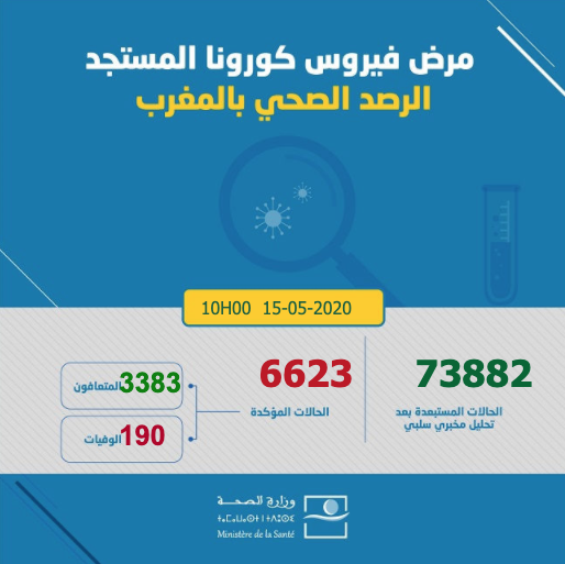 ارتفع عدد الإصابات بفيروس كورونا في المملكة المغربية اليوم الجمعة 15 ماي 2020، إلى حدود الساعة العاشرة صباحة، إلى 6623 حالة، حيث أفادت معطيات وزارة الصحة الرسمية تسجيل زيادة ب 16 حالة جديدة، ليرتفع إجمالي الإصابات التي تم تسجيلها إلى 6623 حالة مؤكدة.