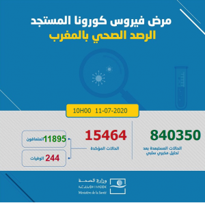 ارتفع عدد الإصابات بفيروس كورونا في المملكة المغربية اليوم السبت 11 يوليوز 2020، إلى حدود الساعة العاشرة صباحا، إلى 15464 حالة، حيث أفادت معطيات وزارة الصحة الرسمية تسجيل زيادة 136 حالات جديدة، ليرتفع إجمالي الإصابات التي تم تسجيلها إلى 15464 حالة مؤكدة.