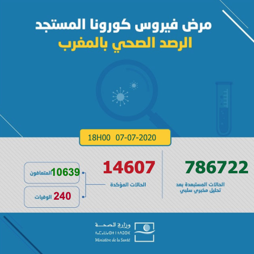 ارتفع عدد الإصابات بفيروس كورونا في المملكة المغربية اليوم الثلاثاء 07 يوليوز 2020، إلى حدود الساعة السادسة مساء، إلى 14607 حالة، حيث أفادت معطيات وزارة الصحة الرسمية تسجيل زيادة 228 حالات جديدة، ليرتفع إجمالي الإصابات التي تم تسجيلها إلى 14607 حالة مؤكدة.