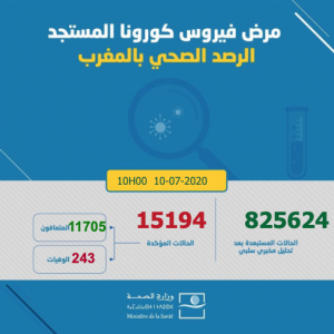 ارتفع عدد الإصابات بفيروس كورونا في المملكة المغربية اليوم الجمعة 10 يوليوز 2020، إلى حدود الساعة العاشرة صباحا، إلى 15079 حالة، حيث أفادت معطيات وزارة الصحة الرسمية تسجيل زيادة 115 حالات جديدة، ليرتفع إجمالي الإصابات التي تم تسجيلها إلى 15194 حالة مؤكدة.