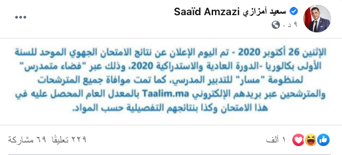 وأضاف المنشور الذي تم مشاركته على صفحة الوزير على الفايس بوك في هذه اللحظة أنه بإمكان المترشحين الذين اجتازوا الامتحانات وأولياء أمورهم الاطلاع على النتائج عبر الولوج إلى “فضاء متمدرس” على منظومة مسار، للتدبير المدرسي، كما أنه تم موافاة جميع المرشحين عبر البريد الالكتروني “Taail.ma” بالمعدل العام المحصل عليه في هذا الامتحان وكذا لنتائجهم التفصيلية.