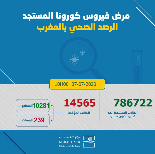 ارتفع عدد الإصابات بفيروس كورونا في المملكة المغربية اليوم الثلاثاء 07 يوليوز 2020، إلى حدود الساعة العاشرة صباحا، إلى 14565 حالة، حيث أفادت معطيات وزارة الصحة الرسمية تسجيل زيادة 186 حالات جديدة، ليرتفع إجمالي الإصابات التي تم تسجيلها إلى 14565 حالة مؤكدة.