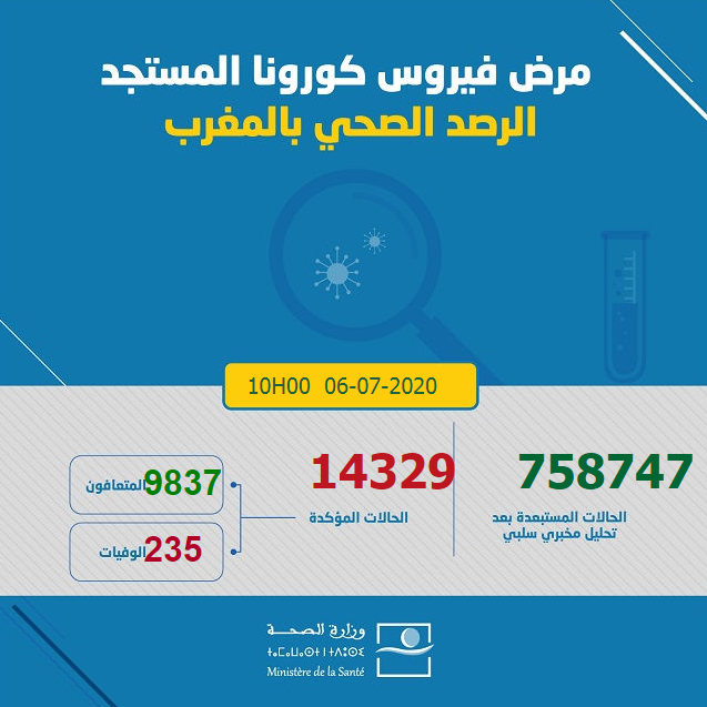 ارتفع عدد الإصابات بفيروس كورونا في المملكة المغربية اليوم الإثنين 06 يوليوز 2020، إلى حدود الساعة العاشرة صباحا، إلى 14329حالة، حيث أفادت معطيات وزارة الصحة الرسمية تسجيل زيادة 114 حالات جديدة، ليرتفع إجمالي الإصابات التي تم تسجيلها إلى 14329 حالة مؤكدة.