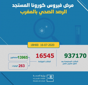 ارتفع عدد الإصابات بفيروس كورونا في المملكة المغربية اليوم الخميس 16 يوليوز 2020، إلى حدود الساعة السادسة مساء، إلى 16545 حالة، حيث أفادت معطيات وزارة الصحة الرسمية تسجيل زيادة 283 حالات جديدة، ليرتفع إجمالي الإصابات التي تم تسجيلها إلى 16545 حالة مؤكدة.