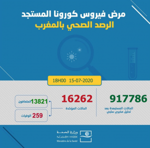 ارتفع عدد الإصابات بفيروس كورونا في المملكة المغربية اليوم الأربعاء 15 يوليوز 2020، إلى حدود الساعة السادسة مساء، إلى 16262 حالة، حيث أفادت معطيات وزارة الصحة الرسمية تسجيل زيادة 165 حالات جديدة، ليرتفع إجمالي الإصابات التي تم تسجيلها إلى 16262 حالة مؤكدة.