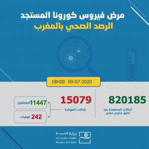 ارتفع عدد الإصابات بفيروس كورونا في المملكة المغربية اليوم الخميس 09 يوليوز 2020، إلى حدود الساعة السادسة مساء، إلى 15079حالة، حيث أفادت معطيات وزارة الصحة الرسمية تسجيل زيادة 308حالات جديدة، ليرتفع إجمالي الإصابات التي تم تسجيلها إلى 15079حالة مؤكدة.