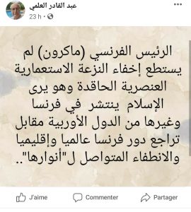 قال الناشط والحقوقي، عبد القادر العلمي، تعليقا على تصريحات الرئيس الفرنسي إيمانويل ماكرون، العنصرية تجاه المسلمين، أن “الرئيس الفرنسي لم يستطع إخفاء النزعة الاستعمارية العنصرية الحاقدة”.