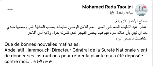 ونشر الناشط المذكور قبل قليل أن عبد اللطيف الحموشي المدير العام للأمن الوطني أعطى تعليماته بسحب الشكاية التي وضعها ضده بعد أن تبين بأن هناك سوء فهم فيما يخص الفيديو الذي نشرته حول ولاية أمن أكادير.