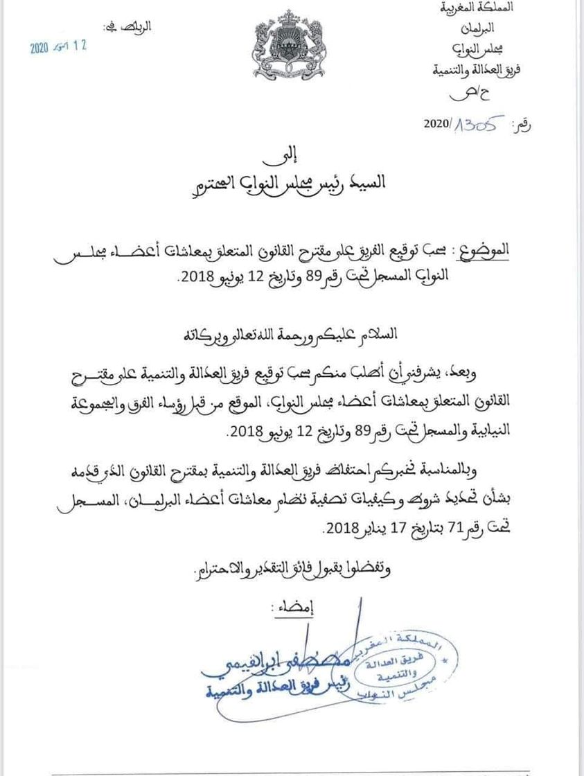 وكتب عبد اللطيف سودو:” يروج في الفايسبوك أن العدالة و التنمية متشبت بتقاعد البرلمانيين لأنه طلب سحب توقيع الفريق على مقترح القانون المسجل تحت رقم 89 بتاريخ 12 يونيو 2018 و المقدم من طرف رؤساء الفرق و المجموعات النيابية .. “.