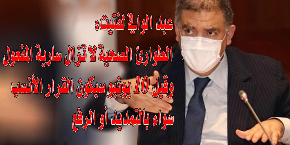 وشدد الوزير على أن الجهات المختصة ستجتمع قبل 10 من يونيو المقبل من أجل تدارس الوضع الميداني وبالتالي اتخاذ القرار الأنسب سواء بتمديد حالة الطوارئ الصحية أو رفعها بشكل تدريجي.