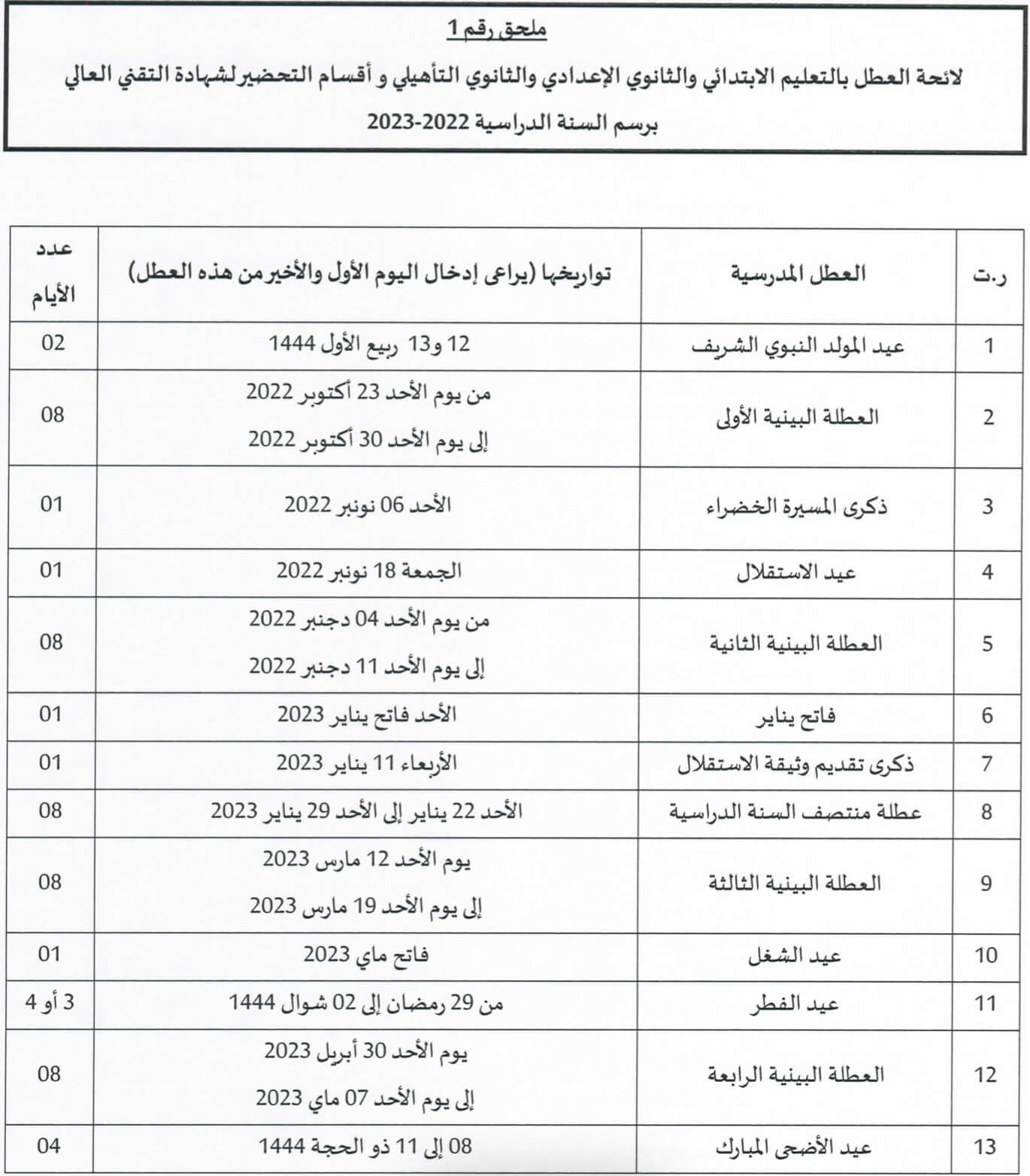 كما سيستفيد التلاميذ من عطلة الفترة البينية الثالثة من 12 إلى 19 مارس 2023، ثم عطلة الفترة البينية الرابعة وعيد الشغل وعيد الفطر، ما بين 1 و7 ماي 2023، ثم عطلة عيد الأضحى.