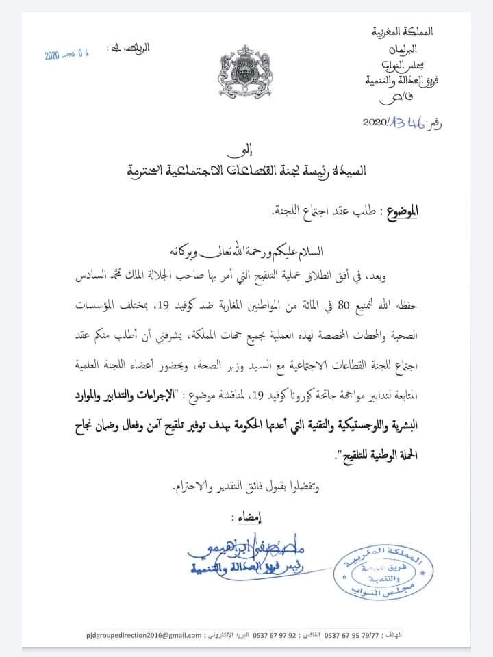 طالب رئيس فريق العدالة والتنمية بمجلس النواب، مصطفى إبراهيمي، رئيسة لجنة القطاعات الإجتماعية بالمجلس، بعقد اجتماع للجنة وذلك بحضور وزير الصحة خالد ايت الطالب للجنة، لمساءلته حول عملية التلقيح الوطنية ضد فيروس كورونا التي تعتزم المملكة البدء فيها.