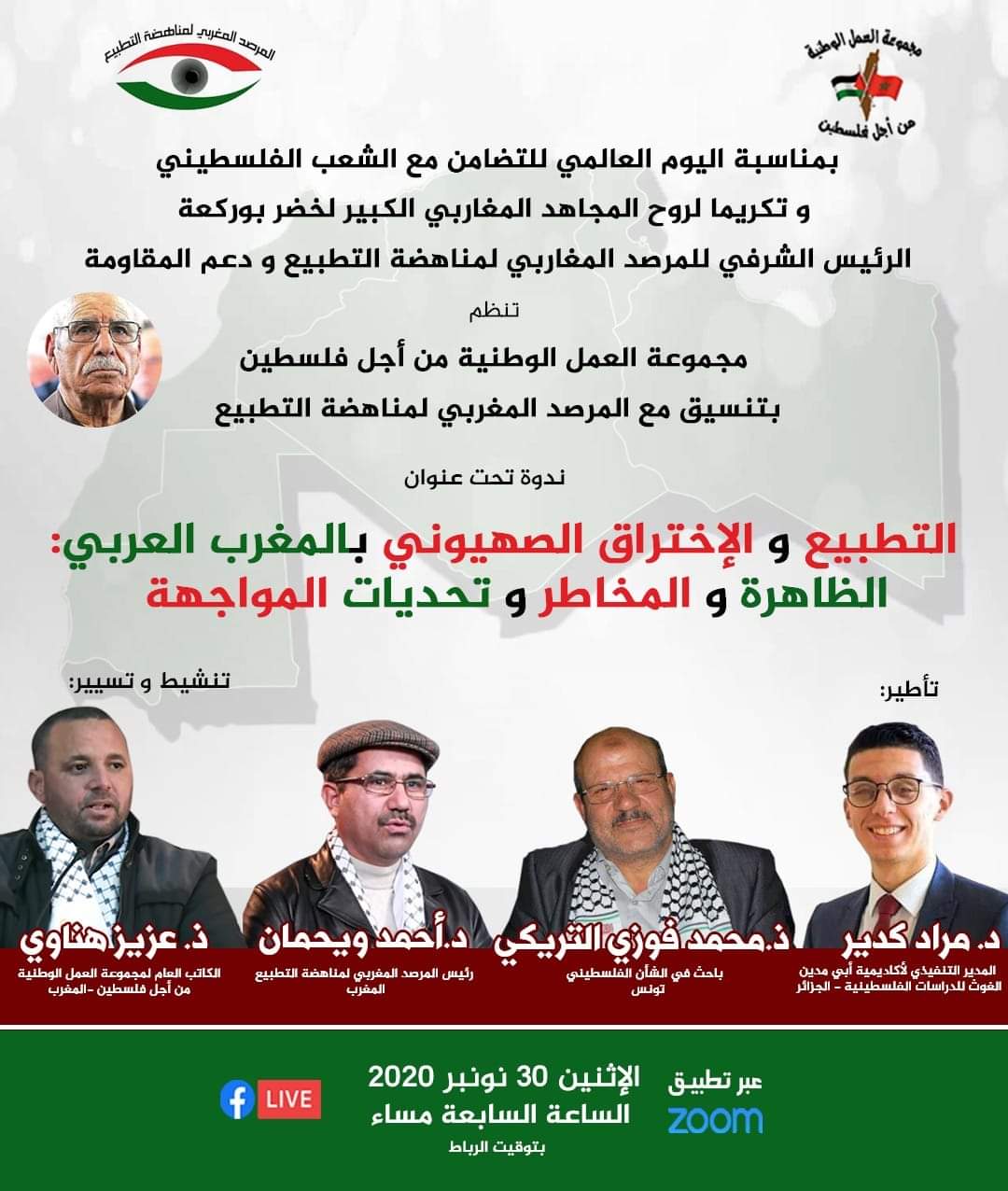 كما يأتي تنظيم هذه الندوة من طرف مجموعة العمل الوطنية من أجل فلسطين، والمرصد المغربي لمناهضة التطبيع، حسب بلاغ الهيئتين، تكريما لروح المجاهد المغاربي الكبير “عمي لخضر بورݣعة”،الرئيس الشرفي للمرصد المغاربي لمناهضة التطبيع و دعم المقاومة.